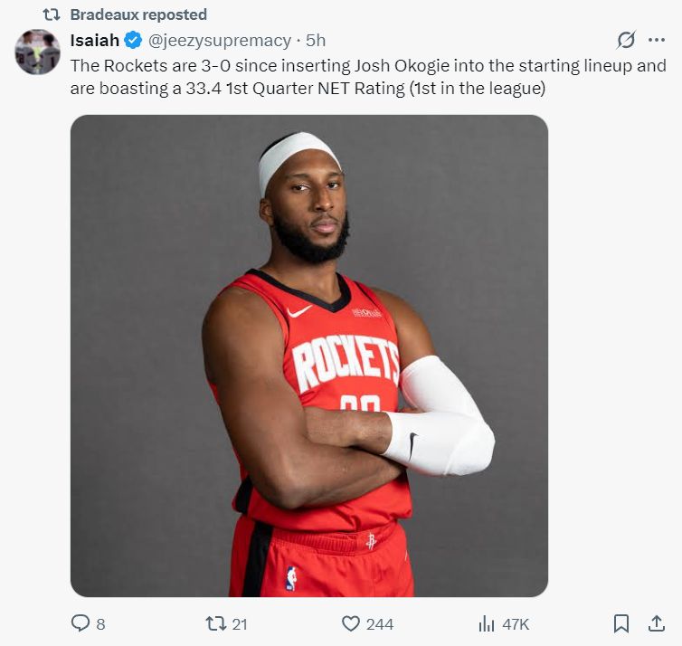 而奥科吉进入先发后的三场比赛火箭队全胜,火箭队首节的净效率值+33.4排在联盟第一,奥科吉本赛季三分命中率高达60%,过去三场比赛10中7,他的防守也非常出色,火箭目前状态正勇没必要去补强PG。