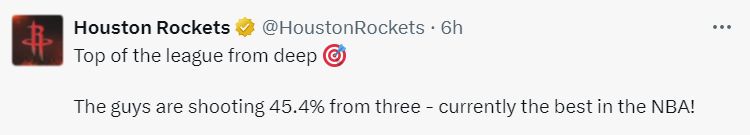 狂胜绿凯的赛后,火箭队官方发布了一条推文:我们的三分球命中率高达45.4%是冠绝NBA联盟的存在。