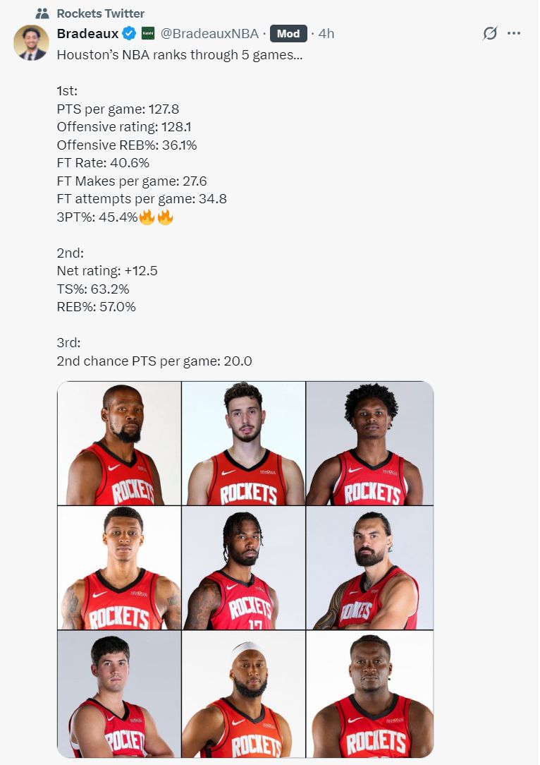 火箭记者Bradeaux晒出了五场比赛后火箭队的一些数据情况: