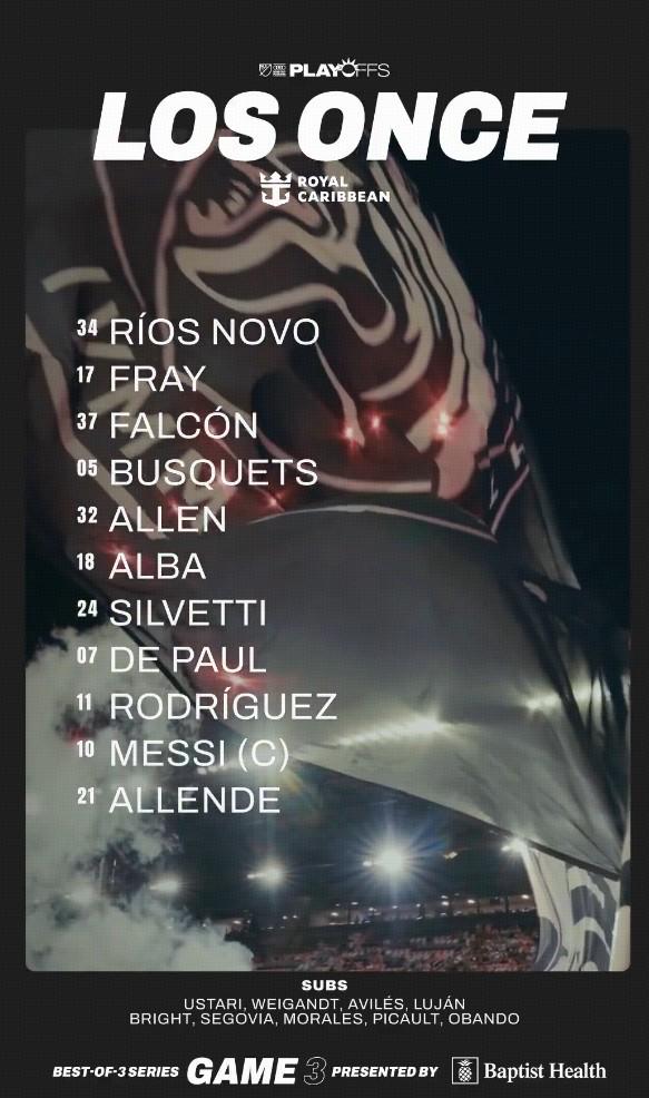 迈阿密国际首发:5-布斯克茨、7-德保罗、10-梅西、11-巴尔塔萨尔-罗德里格斯、17-伊恩-弗雷、18-阿尔巴、21-阿连德、24-马特奥-西尔维蒂、32-诺亚-艾伦、34-里奥斯、37-法尔孔