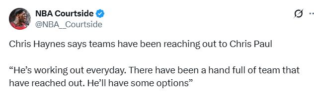 谈到保罗的未来,Haynes说道:“已经有好几支球队主动联系他了,都想知道他接下来的打算。所以他现在的选择余地还挺大的,手头并不缺下家。我觉得他绝对不会就这么草草收场。我完全无法想象他会以这种方式告别赛场。我敢肯定,他本赛季肯定会在某个时间点复出,打完剩下的赛季。”
