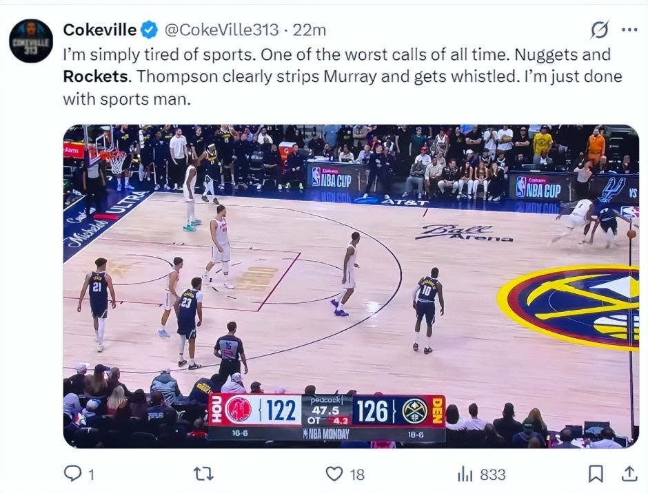美媒Cokeville晒出了阿门抢断穆雷的一幕,这个球就是裁判吹罚犯规送穆雷两罚那个球,他写道:我对体育已经失望了,这是有史以来最糟糕的吹罚之一,阿门明显抢断成功,但裁判却吹了犯规。我对这项运动已经失去了兴趣,再也不想看了。