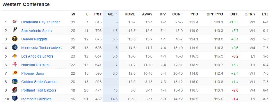 森林狼凭借这一波4连胜已经反超湖人升至西部第四的位置,火箭则掉至西部第六。