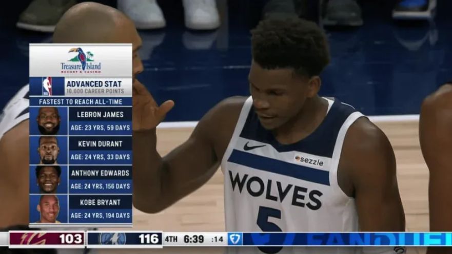 这场比赛爱德华兹一战创造多项纪录:1.他成为森林狼队史最快的10000分先生;