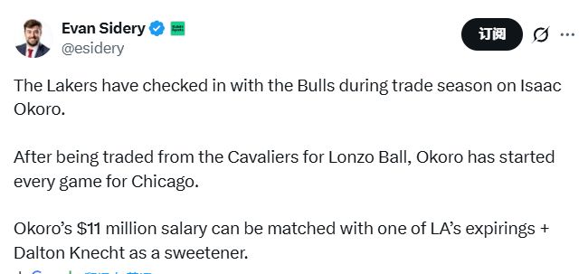 Sidery表示,奥科罗本赛季的薪资为1100万美元,下赛季是1181万美元。湖人可通过一份到期合同+克内克特的组合匹配薪资,完成这笔潜在交易。