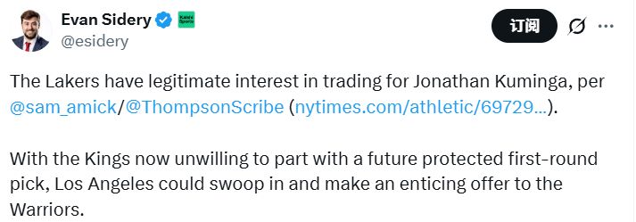 名记Sidery随后表示,鉴于国王队目前不愿为库明加送出未来受保护的首轮签,湖人队或许会趁机介入,向勇士队开出一份更诱人的报价。