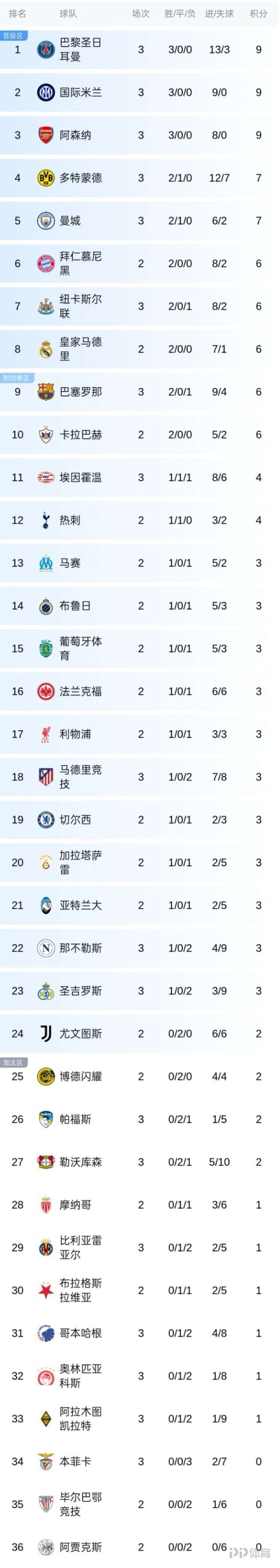 欧冠第三轮首日比赛战罢,最新积分榜情况,巴黎、国米、阿森纳以9分成为前三名队伍!